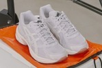 エミ×アシックスのコラボスニーカー、ライトグレーの"メッシュ×マット素材"アッパー