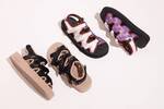 テバ×エミよりオールブラックのコラボサンダル、ストライプ柄ストラップ&スエード素材のソール